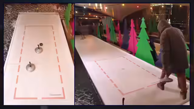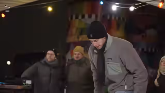 01:17:54Ein neues Spiel beginnt mit einem Schnick-Schnack-Schnuck-Duell, um die Startreihenfolge zu klären. Es folgen die ersten Würfe des Spiels. Radler platziert seinen Stock mittig im Haus, während Jen eine schwierige Aufgabe hat, ins Haus einzufahren. Nach einigen Würfen, bei denen teilweise gegnerische Stöcke unbeabsichtigt geholfen wurden, liegt Team Blau in Führung. Es kommt zu einem bemerkenswerten Wurf, bei dem ein Stock mit hoher Geschwindigkeit vorbeifliegt.