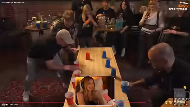 01:30:37Der Streamer interagiert mit dem Chat und scherzt über seine Fähigkeit, Parsisch zu sprechen, während technische Probleme mit dem Greenscreen thematisiert werden. Es folgt eine Diskussion über ein Flip Cup-Event, bei dem die Teilnehmer:innen Getränke aus Bechern leeren müssen, bevor sie die Becher umdrehen. Dies führt zu wettbewerbsorientierten und unterhaltsamen Momenten, insbesondere als Nadine und Janet gegeneinander antreten und Flips ausführen.