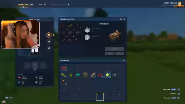02:05:00Nach dem Download startet der Streamer Hytale und beginnt mit der Charaktererstellung. Er wählt ein süßes Aussehen mit roter Schleife und Blaue Augen, speichert den Namen und betritt die Welt. Das Gameplay ist unerfahren, aber neugierig, und er erkundet die Grundmechaniken wie das Crafting von Werkzeugen (Pickaxe, Axt) und das Sammeln von Ressourcen wie Holz und Stein in der anfänglichen Umgebung.