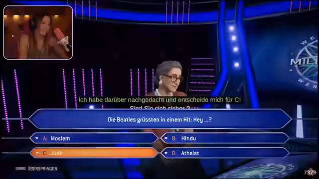 01:54:57Das Spiel 'Wer wird Millionär' beginnt. Die erste Frage für 50 Euro lautet: 'Wie heißt der gesetzlich fixierte Zeitpunkt, zu dem Verkaufslokale schließen?' Die Antwort 'Ladenschluss' wird ausgewählt. Der Chat ist an der Reihe und muss die Frage beantworten, wer Harry Potter gespielt hat. Der Chat wählt mit 100%iger Übereinstimmung Daniel Radcliffe aus. Die nächste Frage für das Streamer-Team lautet: 'Welches Team wird auch Samba Boys genannt?' Die Antwort 'Brasilien' wird ausgewählt. Der Chat ist wieder an der Reihe und muss die Frage beantworten, in welchem Film Lando Calrassian nicht auftritt. Der Chat wählt 'Star Wars, der Aufstieg Skywalkers' aus, was falsch ist. Das Streamer-Team gewinnt einen Punkt. Es wird beschlossen, ein Best-of-3 zu spielen. Der Chat ist an der Reihe und muss die Frage beantworten, welcher dieser Bösewichte kein Gegner von Spider-Man ist. Der Chat wählt Scarecrow aus. Das Streamer-Team muss die Frage beantworten, wie man die vornehme Gesellschaft der oberen 10.000 bezeichnet. Die Antwort 'High Society' wird ausgewählt.