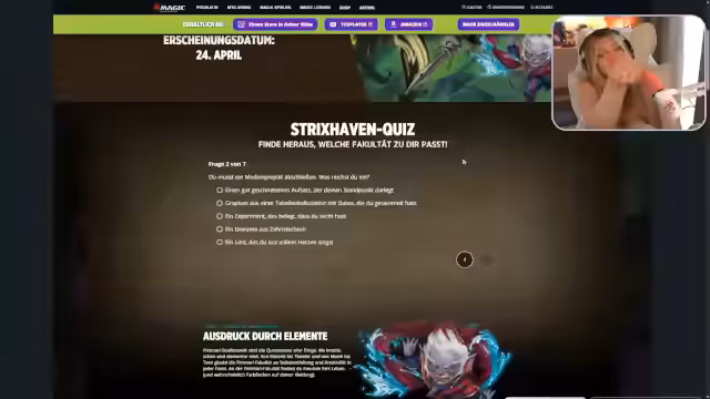 00:33:48Der Stream wechselt zum Thema Magic The Gathering, nachdem der Streamer Werbung beseitigt hat. Er stellt das neue Set 'Geheimnisse von Strixhaven' vor und zeigt den zugehörigen Trailer, der sehr positiv aufgenommen wird. Das Set beinhaltet fünf Fakultäten: Blütenwilk, Prismari, Quantrix, Silberkiel und Kundort. Der Streamer lädt ein, ein Quiz auf der Webseite zu machen, um die passende Fakultät zu finden. Die Silberkiel-Fakultät, die zu seinen Ergebnissen passt, wird als Fakultät für Redekunst und Wettbewerb beschrieben. Weitere Fakultäten wie Prismari für Elementarkunst oder Blütenwerk für Leben und Tod werden ebenfalls vorgestellt. Der Streamer hebt den 24. April als Release-Date hervor.