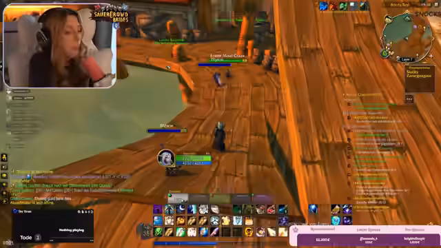 00:50:33Während des Streams wird intensiv gespielt und kommentiert. Die Streamerin reagiert humorvoll auf ihre Erlebnisse, wie z. B. eine unabsichtliche Interaktion, die zu einem 'RP'-Szenario führt, und die Tode anderer Streamer. Sie diskutiert über die Mechaniken des Spiels, ihre装备-Auswahl und die Herausforderungen des Hardcore-Modus. Gleichzeitig wird die Verbundenheit zur Community und zur Gilde 'SourBrigdes' stark betont, nachdem jeder Mitglied seinen ersten Tod hinter sich hat und nun ein gemeinsames Ziel vor Augen haben.