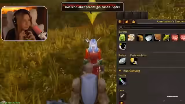 01:27:16Ein Fokus des Streams liegt auf der Organisation des Inventars der Spielfigur. Die Streamerin sortiert Gegenstände, tränkt Tränke und isst Nahrung, um sich zu stärken. Sie macht sich Gedanken über den Tausch von Ausrüstung und die Vor- und Nachteile bestimmter Items für ihren Priester. Gleichzeitig gibt es im Chat Spekulationen über mögliche RP-Rollen innerhalb der Gilde, wie zum Beispiel einen 'Geldverleiher' oder 'Schuldeneintreiber', was zu humorvollen Diskussionen führt.