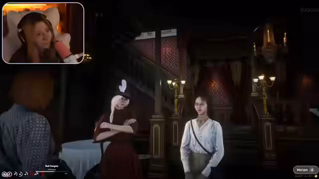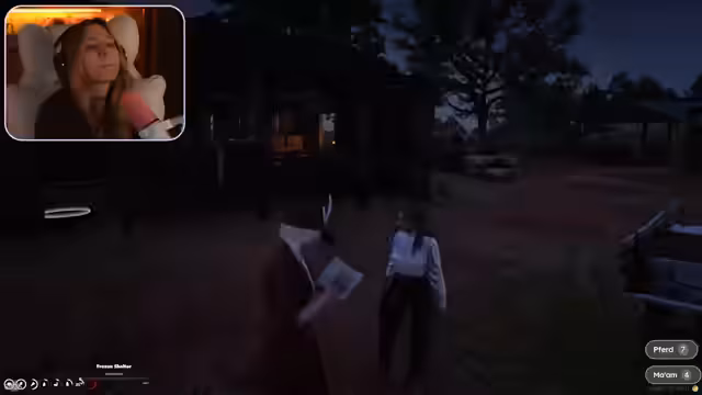 11:14:10Eine zentrale Aufgabe der Streamerin ist der Kauf eines neuen Pferdes, nachdem sie ihr altes verloren hat. Sie sucht einen Pferdestall und trifft auf Mabel Reed, eine Pferdetrainerin. Während des Gesprächs werden RP-Interaktionen detailliert geschildert, wie Smalltalk, Verhandlungen über den Preis des Pferdes und die Aufdeckung von Charakterhintergründen.