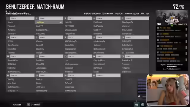 04:22:15Das Turnier beginnt und das Team setzt sich mit verschiedenen Gegnern auseinander. Es kommt zu intensiven Kämpfen und Diskussionen über Spieltaktiken, wie zum Beispiel Waffenwechsel und die richtige Einschätzung von Zielentfernungen. Die Streamerin gibt Ratschläge und reagiert auf Situationen im Spiel, während sie gleichzeitig ihre eigene Performance und die ihrer Teammitglieder analysiert. Es gibt Momente des Erfolgs und des Scheiterns, und das Team arbeitet daran, besser zusammenzuarbeiten und strategische Fehler zu vermeiden, um im Turnier erfolgreich zu sein.