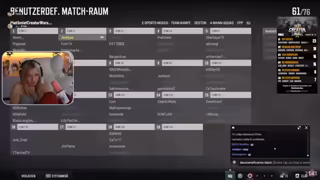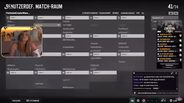 02:04:35Das Stream-Team bereitet sich auf ein bevorstehendes Turnier vor und diskutiert über mögliche Teamzusammensetzungen. Die Streamerin äußert Bedenken wegen des fehlenden Gleichgewichts in der Teamstärke und sucht nach Wegen, dies zu beheben. Der Lobby-Code wird geteilt und es gibt Diskussionen darüber, wer am Spiel teilnehmen kann und wer nicht, was zu kurzfristigen Änderungen in der Teamkonstellation führt.