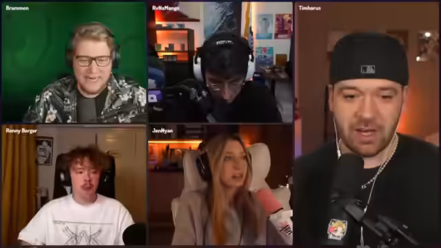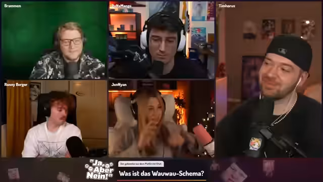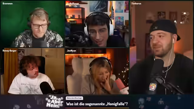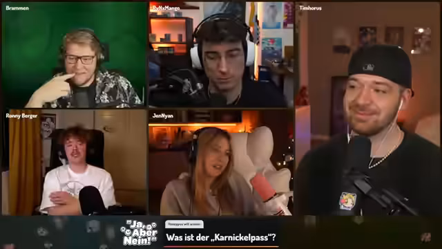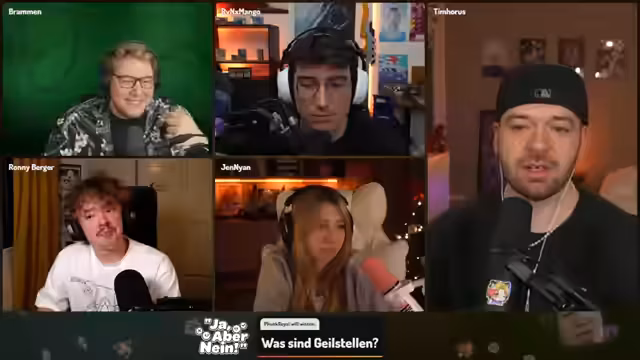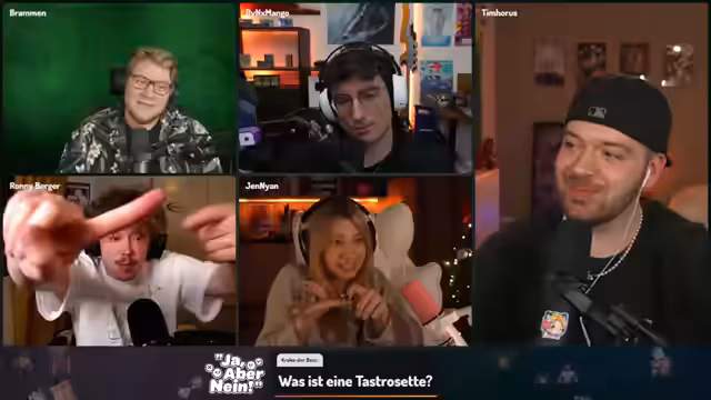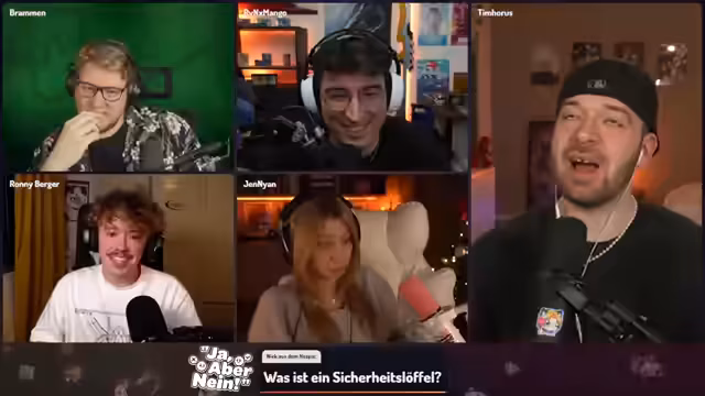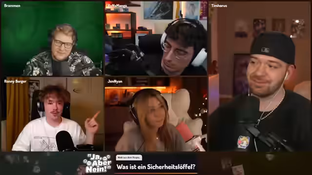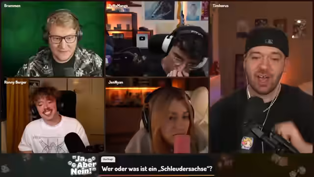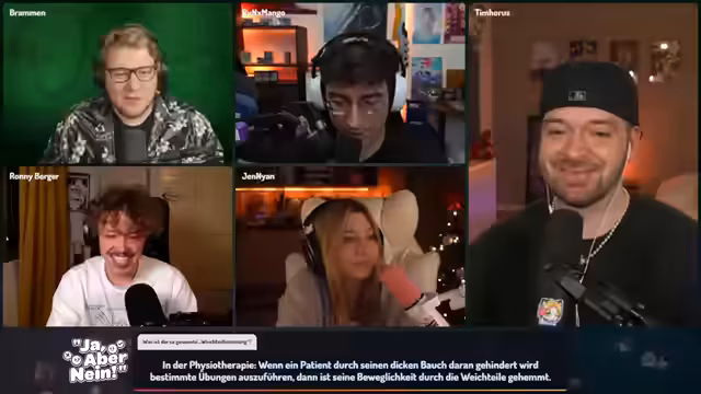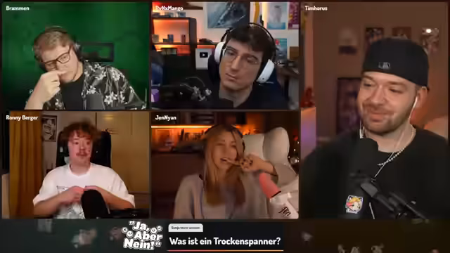 02:10:30Die gemeinsame Show 'Genial Daneben' beginnt mit den Gästen Brammen, Mango, Ronny Berger und Jenyan. Das Format stellt absurde Fragen, die das Team gemeinsam lösen muss. Eingangs erklärt der Moderator die Regeln und heizt die Runde mit humorvollen Kommentaren an. Die erste Frage dreht sich um den Begriff 'Weichteilhemmung'.