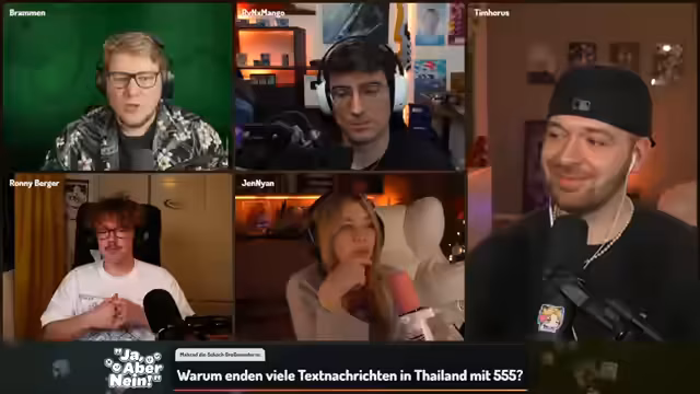 03:13:11Die Gruppe erfährt, warum thailändische Textnachrichten oft mit '555' enden. In der thailändischen Sprache wird die Zahl 5 als 'Ha' ausgesprochen, wodurch '555' dem Lachen 'Hahaha' entspricht. Diese Erkenntnis löst Begeisterung aus, da sie erklärt, warum in thailändischen Twitch-Chats häufig diese Zahlenfolge verwendet wird, um Humor oder Vergnügen auszudrücken.