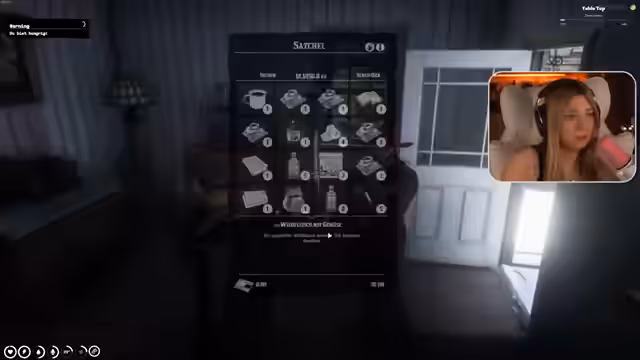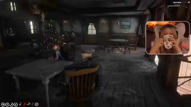 01:50:08Im Rollenspiel konsumiert die Figur Briggs halluzinogene Pilze und ein extrem starkes Getränk namens Ethan Owl, was zu einer schweren Alkoholvergiftung führt. Sie erlebt visuelle Halluzinationen,包括 das Ende der Welt und Blindheit, und erbricht bunte Flüssigkeit. Andere Charaktere versuchen, ihr mit Riechsalz, Milch und anderen Mitteln zu helfen, während der Streamer die Situation kommentiert.