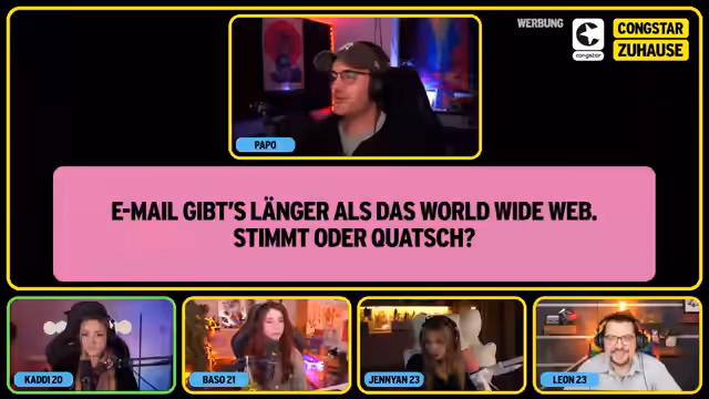 03:03:48Der Stream beginnt mit einer Erklärung des Begriffs VPN (Virtual Private Network), einer Technologie, die eine geschützte und verschlüsselte Verbindung über ein öffentliches Netzwerk herstellt, um Anonymität im Internet zu gewährleisten. Anschließend geht das Quiz in die letzte und entscheidende Runde. Die erste Frage an Kaddi lautet, ob E-Mails länger existieren als das World Wide Web, was Kaddi korrekt mit 'wahr' beantwortet. Die erste netzwerkbasierte E-Mail wurde bereits 1971 über das ARPANET verschickt, dem Vorläufer des Internets. Ray Tomlinson führte dabei das '@'-Zeichen ein. Die nächste Frage an Baso betrifft Cookies und ob sie kleine Textdateien sind. Baso antwortet ebenfalls korrekt mit 'wahr', da Cookies tatsächlich kleine Textdateien sind, die Informationen über den Benutzer und das Gerät speichern, um Funktionen wie Personalisierung oder Warenkörbe zu ermöglichen. Dies bringt Baso auf 24 Punkte.