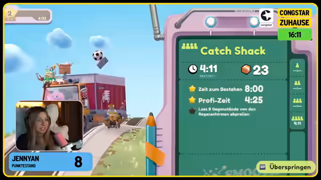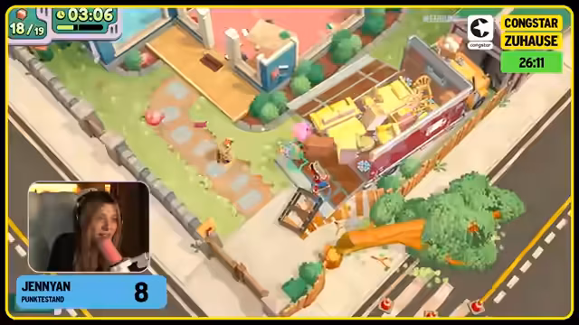 02:09:57Das Team, bestehend aus Baso (grüner Frosch), Kaddi (gelber Fisch), Jen (pinke Wolke) und Leon (der Schuh), stürzt sich in das Spiel Moving Out 2, wo sie die Aufgabe haben, Häuser zu leeren und einzurichten. Die Spieler müssen zusammenarbeiten, um Gegenstände zu bewegen, wobei sie oft auf unkonventionelle Methoden wie das Werfen von Möbeln durch Fenster zurückgreifen. Trotz des chaotischen Gameplays, bei dem auch mal Scheiben zu Bruch gehen oder Gegenstände falsch platziert werden, steht der Spaß und die individuelle Leistung im Vordergrund, die von den Zuschauern bewertet wird. Die Herausforderung besteht darin, alle gelb markierten Gegenstände innerhalb eines Zeitlimits in den Umzugswagen zu verladen. Dabei zeigt sich, dass selbst vermeintlich einfache Aufgaben wie das Bewegen einer Toilette durch ein Fenster zu unerwarteten Schwierigkeiten führen können, was für viel Gelächter sorgt und die Dynamik des Teams auf die Probe stellt. Die Spieler müssen sich schnell an die Gegebenheiten anpassen und kreative Lösungen finden, um die Umzüge erfolgreich abzuschließen.