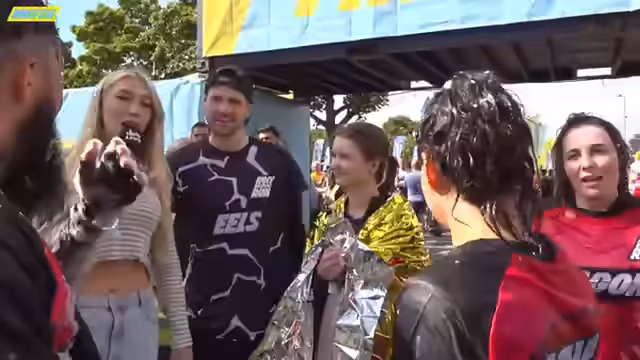 03:16:24Die Frogs erreichen mit einer Zeit von 47 Minuten und 10 Sekunden das Ziel, bestehend aus Ette Schlappen, LeonTV, Roofless Domi und Roofless Fredo. Nach dem Lauf der Creator kommen Teilnehmer, die noch 10 oder 12 Kilometer rennen wollen. Die Kommentatoren loben die Leistung der Frogs. Nova interviewt die Frogs und fragt nach ihren Erfahrungen. Die Frogs erzählen von den Herausforderungen, insbesondere dem Tunnelblick und dem Wiedereinstieg nach dem Wasserhindernis. Sie loben ihre Team-Symbiose und den Spaß, den sie trotz der Anstrengung hatten. Als Highlight nennen sie das kopfüber Rutschen. Die Sharks erreichen ebenfalls das Ziel, gefolgt vom Holy Hot Food Run Team. Es wird spekuliert, ob die Frogs alle Hindernisse korrekt absolviert haben.