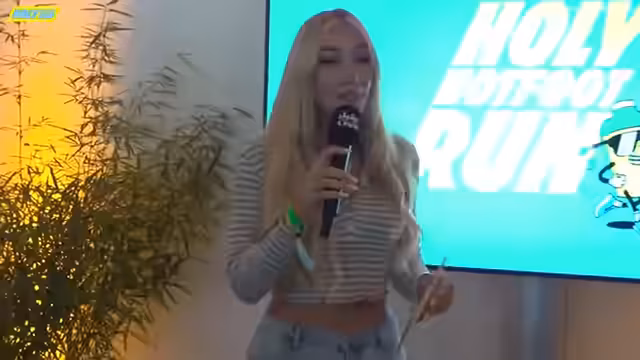 02:11:55Nach der Vorstellung aller Teams kündigt die Moderatorin eine große Neuankündigung an. Nach einem Jahr der Entwicklung präsentiert sie eine exklusive, neue Sorte Hydration-Drink von Holy in Zusammenarbeit mit Rezo. Die Drachenfrucht-Sorte wird als Zero-Zucker-Option mit Elektrolyten beworben. Die Moderatorin und Rezo probieren das Getränk live, loben den Geschmack und geben einen exklusiven 10%-Rabatt-Code für die Zuschauer heraus.