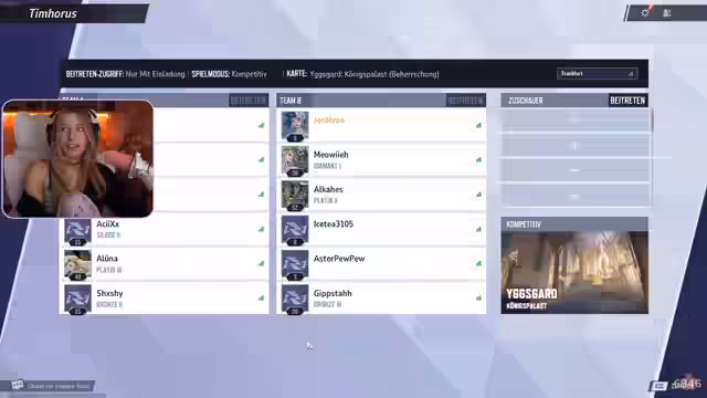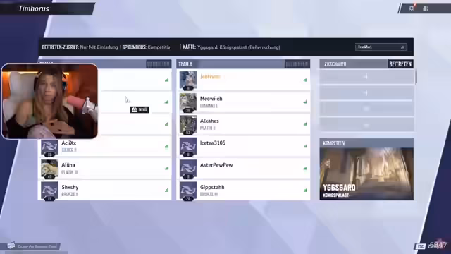 00:54:17Die ersten Begegnungen im Marvel Rivals Turnier stehen fest: Dalu gegen Kaddi, Jen gegen Tim, Kroko gegen Asmugel und Sarah gegen Papo. Die zweite Begegnung ist Dalu gegen Jen, Kaddi gegen Tim, Kroko gegen Sarah. Die dritte Begegnung ist Kroko gegen Papo und Asmugel gegen Sarah. Es wird darauf hingewiesen, dass von Anfang an auf Competitive umgestellt werden soll. Die Teamkapitäne sollen Bescheid geben, wenn die Lobby voll ist und bereit sind. Leon wird sich jeweils ein Matchup aussuchen, das er sich anschaut. Es wird angestrebt, bis Viertel nach oder 20 nach mit dem ersten Spiel zu beginnen. Jen muss Team Jen einladen und Tim hat bereits aufgemacht. Die Teamkapitäne können wieder zu ihren Teams gehen und bei Fragen den Discord oder den Stream-Chat nutzen. Es wird ein gemeinsamer Stream eingerichtet, bei dem der Chat jedoch ausgelassen wird, um Tipps nicht zu übersehen. Der Raum ist offen und die Spieler müssen sich gegenseitig adden.