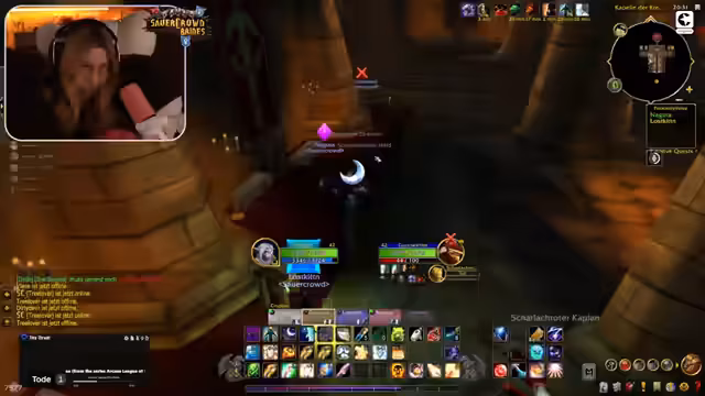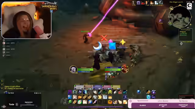 05:02:34Nach einem technischen Absturz des Laptops setzt die Streamerin das Gameplay fort und spielt mit ihrer Gruppe durch den Dungeon. Der Fokus liegt auf dem Zusammenspiel und der Kommunikation mit den Mitspielern, als sie einen Boss bekämpfen. In diesem Zusammenhang taucht ein persönlicher Moment auf, als der Chat berichtet, dass die Mutter eines Spielers im Stream sei. Die Streamerin zeigt sich von dieser Kreativität und Unterstützung durch die Eltern begeistert, was zu einer emotionalen und witzigen Anekdote führt und die positive, unterstützende Atmosphäre im Stream unterstreicht.
