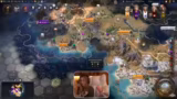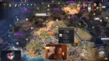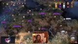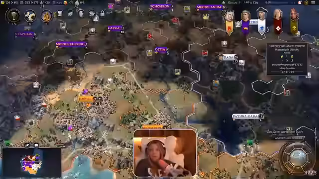 01:31:25Das Spiel beginnt, sich zu entwickeln. Die Streamerin erwähnt ihre missliche Lage: sie ist als Ägypter in der Arktis gelandet und fühlt sich stark benachteiligt. Sie äußert ihre Unzufriedenheit mit dem Startplatz und fragt den Chat nach der Einschätzung. Auch diplomatische Beziehungen zwischen den Spielern werden ein Thema. Ein Mitspieler wird angegriffen und die Streamerin zeigt sich kooperationsbereit, indem sie vorschlägt, Gebiete friedlich aufzuteilen, während ein anderer Spieler bereits aggressive Absichten an den Tag legt.