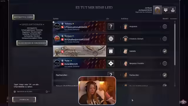 05:27:37Aufgrund wiederholter Abstürze und technischer Probleme bei der Synchronisation des Spiels, insbesondere im Zusammenhang mit dem Aster-Spieler, wird empfohlen, das Spiel neu zu starten. Ein Tipp wird gegeben, alle sollten das Spiel einmal neu starten, da der Aufwand nicht mehr groß sei. Es wird diskutiert, ob es besser sei, die Spielerzahl auf drei zu reduzieren, da das Problem bei zu Spielern nicht aufgetreten sei. Die Stimmung ist angespannt, aber ein Neuanfang mit einem neuen Code wird als Lösung gesehen.
