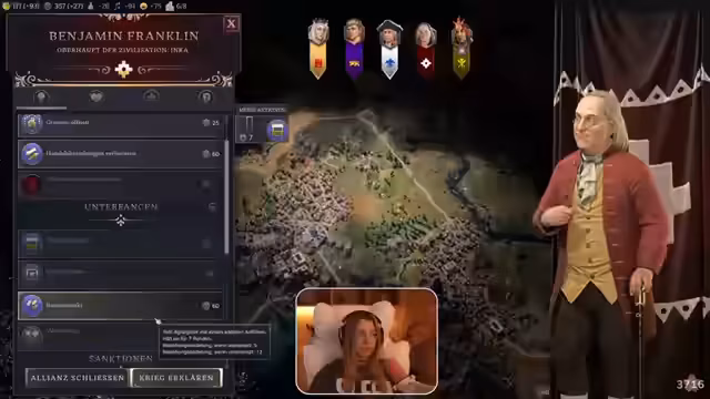 06:41:37Die Streamerin diskutiert mit anderen Spielern über die aktuelle Kriegssituation und mögliche Allianzen. Sie äußert sich fasziniert von der neuen Welt im Spiel und plant, ihre Strategie anzupassen. Es wird überlegt, ob man dem Gegner den Krieg erklären soll. Sie spricht über die Schwierigkeit, Allianzen zu bilden, und die Notwendigkeit, den Ruf in der Welt aufrechtzuerhalten. Die Streamerin erklärt, dass sie Krieg erklärt wurde, da sie eine feindliche Beziehung hat. Es wird überlegt, ob man ein Abkommen schließen kann, bevor man den Krieg erklärt. Sie spricht über ein früheres Bündnis und die Schwierigkeit, Hass zu erzeugen, um Kriegsunterstützung zu erhalten. Die Streamerin analysiert die Stärken und Schwächen der Gegner und plant ihre nächsten Schritte, um im Spiel erfolgreich zu sein. Sie tauscht sich mit anderen Spielern über ihre Strategien aus und versucht, die bestmöglichen Entscheidungen zu treffen.