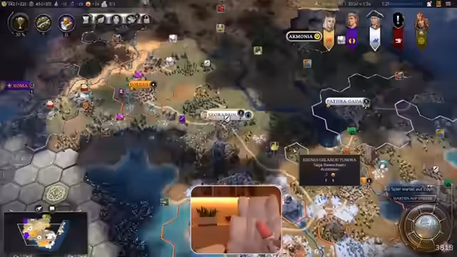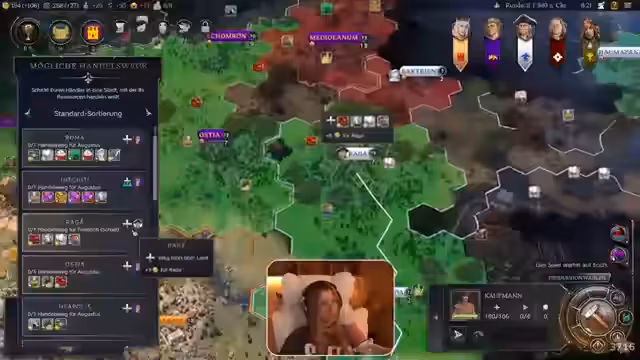 02:21:28Die Streamerin nutzt die Handelsmöglichkeiten des Spiels, um Beziehungen zu festigen. Sie schickt einen ersten Handelskaufmann und öffnet die Grenzen, um Vertrauen aufzubauen. Gleichzeitig sammelt sie Informationen über die Stärken der Mitspieler. Ein Spieler bündelt seine Truppen zur Verteidigung, während ein anderer Stadtstaaten einverleibt, um seine Macht zu sichern. Die Streamerin bleibt in ihrer defensiven Haltung und sucht nach Wegen, ihre Expansion fortzusetzen.