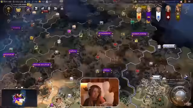 02:32:46Das Spiel schreitet weiter voran. Die Streamerin widmet sich dem Aufbau ihrer Städte und versucht, ihre Ressourcenprobleme, insbesondere das Fehlen von Gold, zu lösen. Sie interagiert weiterhin diplomatisch mit den Spielern und berät einen Anfänger, der die Grundprinzipien des Spiels noch nicht verstanden hat. Es kommt zu taktischen Entscheidungen, wie dem Ankauf von Truppen und die Sicherung von Ressourcen, während die Spannungen zwischen den einzelnen Spielern weiter bestehen bleiben.