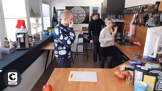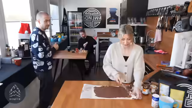 00:42:12Niklas und Jen vergleichen ihre Kaffeegewohnheiten: Niklas schwärmt für Kubaner-Kaffee vom Hamburger Händler EDK, Jen bevorzugt einen mit Karamellsirup. Die Gruppe versucht, Niklas zu überreden, Jen's Kaffee zu probieren. Später erklärt Jen überraschend „Weihnachtsäpfel“ mit eingearbeiteten Sternen als Weihnachtstradition – was als Scherz entlarvt wird, da die Äpfel natürlich keine Sterne tragen.