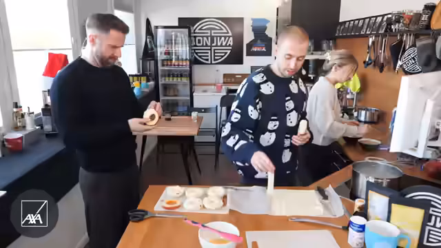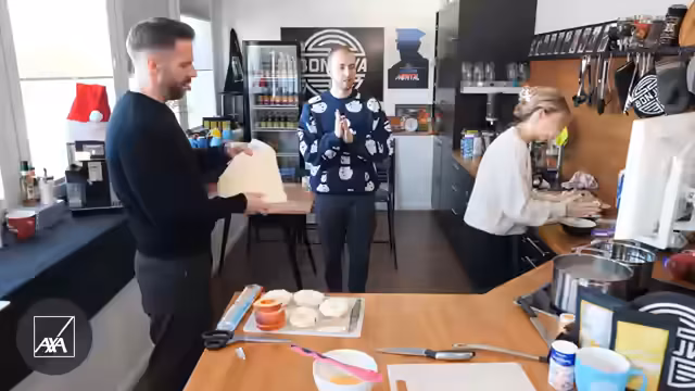 00:19:43Aufgrund der mangelnden Küchenkünste von Asta und Niklas wurden zwei einfache Weihnachtsbackrepte ausgewählt. Zum einen werden Äpfel in Ringe geschnitten, mit Blätterteig ummantelt und mit Puderzucker bestäubt. Als zweite Kreation wird ein ganzer Blätterteig großflächig mit Nutella bestrichen, um daraus entweder einen riesigen Weihnachtsbaum oder kleine Weihnachtsbäumchen zu formen. Zusätzlich werden im Hintergrund Puddingnudeln gekocht.