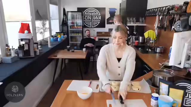 01:49:28Es werden selbstgemachte Nutella-Bäumchen und Apfelringe gebacken. Trotz anfänglicher Herausforderungen mit dem Teig und der Zubereitung, wie ungleichmäßige Backergebnisse und falsche Zutaten, werden die Produkte probiert. Die Nutella-Bäumchen schmecken positiv, während die Apfelringe überraschend gut bewertet werden und an Apfelkuchen erinnern. Die Teilnehmer diskutieren die Schwierigkeiten des Backens im Vergleich zum Kochen und die Freude am gelungenen Ergebnis.