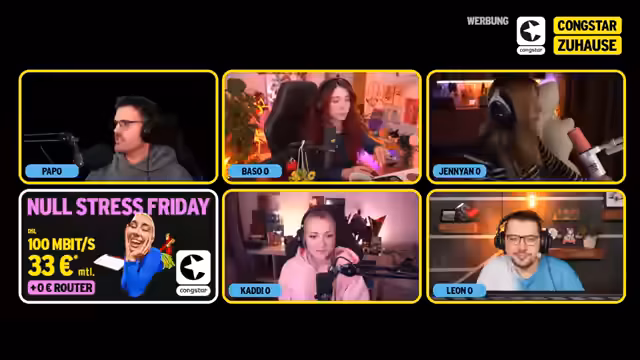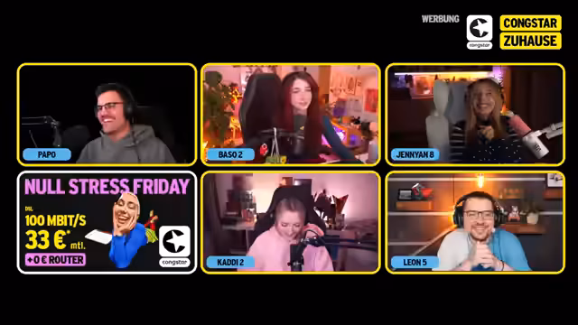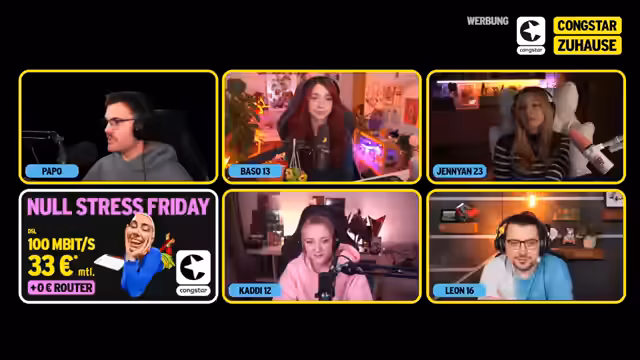 04:42:11Nach dem intensiven Chat-Voting werden die Ergebnisse bekannt gegeben: Papo gewinnt mit 98% der Votes, gefolgt von Basel mit 29%. Die Teilnehmer bedanken sich beim Chat für die Unterstützung und loben die Interaktion. Im Anschluss wird die Partnerschaft mit Kongstar hervorgehoben und der aktuelle 'Null-Stress-Friday'-Tarif beworben: 100 Mbit pro Sekunde für 33 Euro monatlich, inklusive Router für 0 Euro. Die Zuschauer werden ermutigt, den Link im Chat zu nutzen, um sich über die Angebote zu informieren, insbesondere den neuen Zuhause-Tarif von Kongstar. Der aktuelle Zwischenstand der Punkte beträgt 14 zu 7 zu 7 zu 3, was auf einen deutlichen Vorsprung für Jen hindeutet, während Kaddi und Baso noch aufholen müssen.