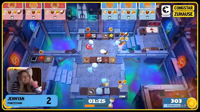 03:02:02Es wird angekündigt, dass dies der letzte Kongstar-Stream des Jahres ist, was bei den Zuschauern Bedauern auslöst. Der Stream findet als 'Kongstar-Zuhause-Stream Nr. 2' statt, da die Teilnehmer nicht physisch beieinander sind, ähnlich wie der erste Stream vor zwei Wochen, bei dem bereits eine kleine Gameshow stattfand. Die Moderation übernimmt Leon, und die Teilnehmer sind Baso, die sich etwas krank fühlt, Jenyan und Kaddi, die als 'Brain' bezeichnet wird. Der Stream wird von Kongstar gesponsert, die ihren 'Zuhause-Tarif' mit 100 Mbit/s für 33 Euro pro Monat ohne Routerkosten bewerben. Neben Gesprächen werden auch Spiele gespielt. Es sind drei verschiedene Spiele geplant: zwei Videospiele und ein Quiz. Das erste Spiel ist Overcooked 2, bei dem der Moderator mitspielen darf, um das Geschehen zu beeinflussen. Die Community hat später die Möglichkeit, Punkte für die Leistungen ihrer Lieblingsstreamer zu vergeben, und im Quiz gibt es Punkte für richtig beantwortete Fragen. Das Quiz-Thema sind 'populärste Alltagsmythen'.