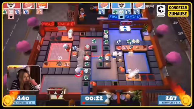 03:09:38Im Spiel Overcooked 2 wird der Modus 'Best of Seven' gespielt, bei dem das Team gewinnt, das nach sieben Maps die meisten Runden gewonnen hat. Der Spielmodus ist 'Zwei versus Zwei'. Die Teams werden durch eine spontane Abstimmung mit Daumen hoch oder runter gebildet: Leon und Jenyan bilden Team Rot, während Baso und Kaddi Team Blau sind. Die erste Runde wird auf der Sushi-City-Map gespielt, die sich als kompliziert erweist, da die Spieler sich an die Steuerung und die Teamarbeit gewöhnen müssen. Trotz anfänglicher Verwirrung und chaotischer Kommunikation, bei der alle durcheinanderreden, gelingt es Team Rot, die erste Runde zu gewinnen. Die zweite Runde findet auf einer Pizza-Map statt, die ebenfalls herausfordernd ist, da die Spieler Schwierigkeiten haben, die Zutaten zu koordinieren und die Öfen zu nutzen. Team Blau schafft es, diese Runde zu gewinnen, wodurch der Spielstand auf 1:1 ausgeglichen wird. Die dritte Runde wird auf einer Pasta-Map gespielt, bei der es um die Zubereitung von Pasta mit Pilzen und Fleisch geht. Auch hier kommt es zu Missverständnissen und kleinen Sabotageakten zwischen den Teams, was die Runde besonders unterhaltsam macht. Am Ende gewinnt Team Rot diese Runde, sodass der Spielstand 2:1 für Leon und Jenyan steht.