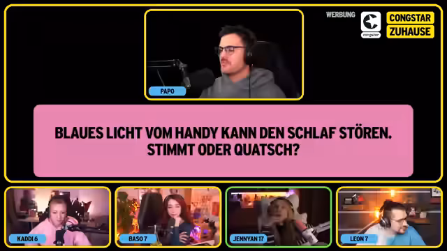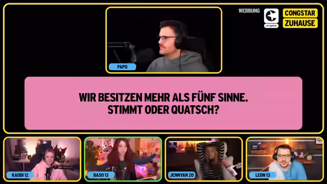 04:51:34Die zweite Runde des Quizes beginnt mit offenen Fragen, die sich jedoch als weitere Wahr-oder-Falsch-Fragen herausstellen. Kaddi beantwortet die Frage, ob Holzbrettchen prinzipiell unhygienischer als Plastikbrettchen sind, korrekt mit 'Quatsch', da Holz antibakterielle Eigenschaften haben kann und Plastikbrettchen Keim-Sammelpunkte entwickeln können. Baso wird gefragt, ob ein verschluckter Kaugummi bis zu sieben Wochen im Magen bleibt, und antwortet richtig mit 'Quatsch', da er innerhalb weniger Tage zersetzt wird. Jenyan beantwortet die Frage, ob Fensterscheiben von innen beschlagen, wenn die Luft im Raum feucht und die Scheibe kalt ist, korrekt mit 'stimmt'. Leon beantwortet die Frage, ob die Strahlung eines Smartphones nachts als Wecker neben dem Kopfkissen auf Dauer krank macht, korrekt mit 'Quatsch', da nach aktuellem Stand der Wissenschaft keine gesundheitliche Gefahr von Mobilfunkstrahlen innerhalb der Grenzwerte ausgeht. In der letzten Frage für Kaddi, ob eine Münze, die von einem Wolkenkratzer fällt, einen Menschen schwer verletzen kann, antwortet sie 'stimmt', was jedoch falsch ist, da der Luftwiderstand die Münze abbremst. Baso beantwortet die Frage, ob wir mehr als fünf Sinne besitzen, korrekt mit 'stimmt', da neben den klassischen Sinnen auch der Gleichgewichtssinn und die Propriozeption dazugehören. Jenyan beantwortet die Frage, ob der Kaumuskel im Verhältnis zu seiner Größe der stärkste Muskel des Körpers ist, korrekt mit 'stimmt'. Leon beantwortet die letzte Frage, ob wir nur 30% unseres Gehirns nutzen, korrekt mit 'Quatsch', da das gesamte Gehirn aktiv ist, wenn auch nicht alle Bereiche gleichzeitig. Am Ende des Quizes hat Jen 23 Punkte, Leon 16 Punkte, Baso 13 Punkte und Kaddi 12 Punkte. Jenyan wird zur Gewinnerin des Kongstar-Zuhause-Streams gekürt.