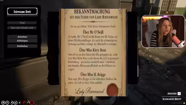 08:05:07Die Erzählerin berichtet von einer verwirrenden Begegnung mit Mr. Weber, der sie fälschlicherweise für seine Assistentin Miss Gibson hielt. In seinem betrunkenen Zustand vertraute er ihr persönliche Gefühle an und sprach über seine problematische Beziehung zu Miss Briggs, die seinen Ruf schädigen würde. Obwohl die Erzählerin versuchte, ihn von Miss Briggs abzubringen, betonte Mr. Weber, dass er sie niemals verlassen könne. Die Situation wurde noch komplizierter, als die echte Miss Gibson auftauchte und die peinliche Szene miterlebte. Parallel dazu plant die Erzählerin, Vaylin nichts von den jüngsten Ereignissen zu erzählen, um ihre eigene Position zu schützen, da sie sich bewusst für eine bestimmte Seite entschieden hat. Sie reflektiert über die Notwendigkeit, Lügen mit Wahrheiten zu paaren, eine Lehre, die sie von einem weisen Piraten erhalten hat, um ihre Handlungen zu rechtfertigen und ihre Geheimnisse zu wahren. Die komplexen emotionalen Verstrickungen und strategischen Lügen prägen diesen Abschnitt des Streams.