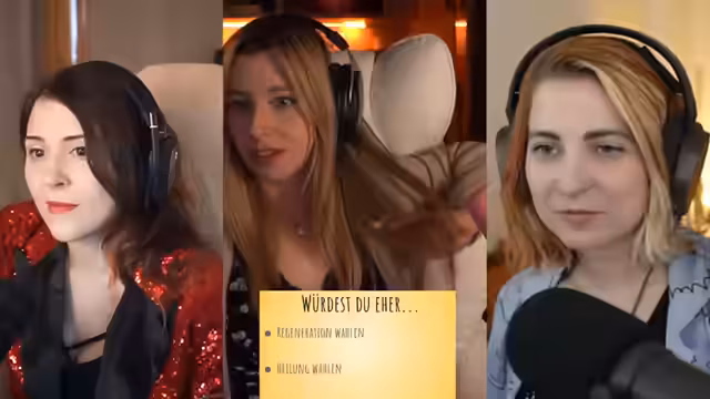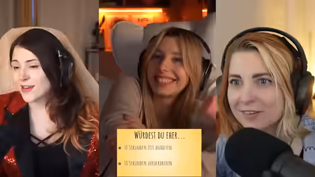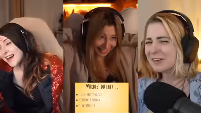 05:55:59Der Stream bereitet sich auf eine Gameshow vor, die mit zwei weiblichen Gästen stattfinden soll. Die Sprecherin erwähnt, dass die Gameshow absichtlich 'unfassbar scuffed' gestaltet sein wird, da sie Twitch nicht als reines Fernsehen sieht und den 'Twitch Classic' zurückbringen möchte. Die Gäste, Jen und Panik-Fee, werden in den Stream eingeladen, wobei technische Schwierigkeiten mit VDO Ninja auftreten, die humorvoll kommentiert werden. Es wird scherzhaft über Abendgarderobe gesprochen, wobei Panik-Fee überraschend in einem Pyjama erscheint, was für Belustigung sorgt. Die Gameshow trägt den Titel 'Meine beschissene Gameshow' und wird als Format vorgestellt, das auch auf YouTube erscheinen soll. Die Gäste werden nacheinander eingeführt, wobei Jen als 'bezaubernde, wundervolle, großartige Jen-Jan' und Panik-Fee als 'bezaubernde Panik-Tee' vorgestellt werden. Beide stellen sich kurz vor, wobei Panik-Fee humorvoll erwähnt, seit einem Jahr aus dem Koffer zu leben und bald eine Wohnung mit riesigem Keller zu beziehen. Es wird klargestellt, dass es in der Gameshow keine materiellen Preise zu gewinnen gibt, sondern lediglich die 'Ehre'.