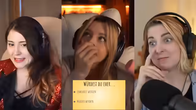 06:17:10Die Gameshow beginnt mit der ersten Frage des Formats 'Entweder oder'. Die Regeln besagen, dass die Teilnehmer sich für eine von zwei Optionen entscheiden und ihre Wahl begründen müssen. Punkte werden vergeben, wenn die Wahl mit der Mehrheit der Abstimmungen auf Reddit übereinstimmt. Die erste Frage lautet: 'Würdest du eher 2 Millionen Euro erhalten, aber jeder kann deine Gedanken lesen, oder einen Cheeseburger essen?' Jen entscheidet sich für den Cheeseburger, da ihre Gedanken 'manchmal sehr schmutzig' seien und sie befürchtet, dass der Besitz von 2 Millionen Euro ihre Leidenschaft für ihren Stream nehmen würde. Panik-Fee wählt die 2 Millionen Euro, da sie glaubt, dass die meisten Menschen mit ihren Gedanken überfordert wären und sie sich in vielen Situationen nicht erklären müsste. Die Reddit-Abstimmung zeigt, dass die Mehrheit (5.223 von 7.132) den Cheeseburger gewählt hat, womit Jen den ersten Punkt erhält. Die zweite Frage lautet: 'Würdest du eher 100 Millionen im Lotto gewinnen, aber im TV ausgestrahlt werden, oder 10 Millionen erhalten, ohne dass jemand davon weiß?' Beide Gäste, Jen und Panik-Fee, wählen die 100 Millionen Euro, da sie die öffentliche Bekanntheit nicht als Problem sehen und das zusätzliche Geld für Spenden oder zur Steigerung der Reichweite nutzen könnten. Reddit entschied sich jedoch mit knapper Mehrheit (3.924 von 7.074) für die 10 Millionen ohne Bekanntheit, wodurch beide keinen Punkt erhalten.