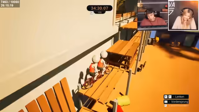 02:21:24Nach der Installation des Spiels 'Try to Drive' beginnt der eigentliche Spielmodus. Es werden Teams gebildet und die Grundmechaniken erklärt: Der vordere Spieler lenkt und der hintere gibt Gas. Der Spielspaas liegt in der koordinierten Steuerung des Fahrrads. Eine Testrunde offenbart die Schwierigkeiten, insbesondere bei der Koordination von Sprüngen. Das Spiel findet als 'Checkpoint-Rennen' statt, bei dem die Teams versuchen, als Erste den dritten Checkpoint zu erreichen.