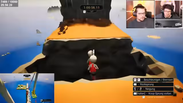 02:57:46Nach anfänglichen Schwierigkeiten wird der erste Checkpoint erreicht, was den Streamern und Zuschauern Auftrieb gibt. Der Druck steigt jedoch, da alle zuschauen und jeder Fehler unangenehmer wird. Die Gruppe rät sich, gemeinsam durchzuhalten und verspricht sich in einem fiktiven Spiel namens Halo "zurückzuzahlen". Strategien werden besprochen, wie man Hindernisse am besten überwindet, etwa durch präzises Timing und koordiniertes Springen und Bremsen.