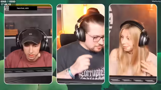 00:09:54Ein weiterer Gast, Leon, tritt zum Stream hinzu. Es entwickelt sich ein humorvolles Segment, bei dem ein gemeinsamer Freund namens Marcel im Raum erscheint. Marcel bringt Jen Kaffee, einen abgefallenen Keks, einen Rasierer und andere Dinge mit. Während eines Keks-Tests mit Yannick beschreibt dieser, dass die so weich sind, dass sie fast flüssig sind. Yannick nutzt den Rasierer, um dessen Geräusch im Mikrofon zu demonstrieren.