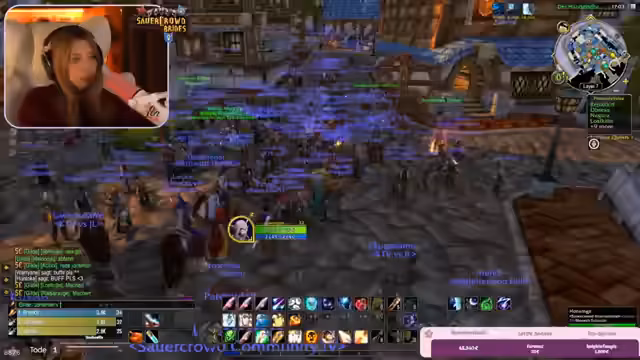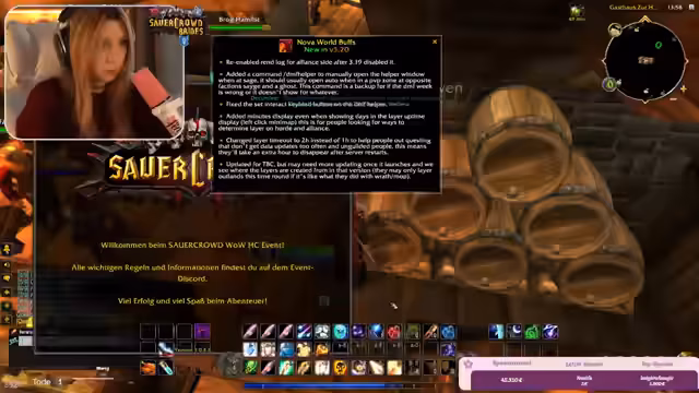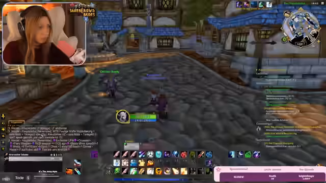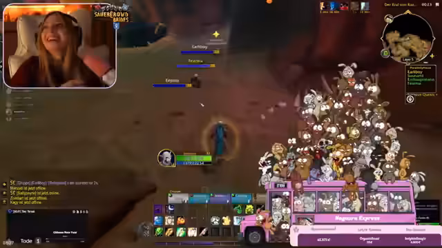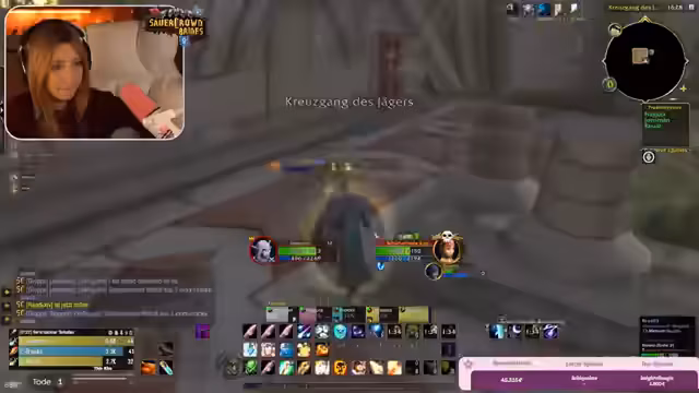 00:42:02Es werden neue Namen im Spiel erwähnt, die plötzlich aufgetaucht sind und offenbar zum Projekt 'Sauerkraut' gehören. Die Streamerin zeigt sich erfreut über die Rückkehr von Spielern wie Sonja, die anfangs skeptisch war, sich aber jetzt voll ins Projekt stürzt. Die Community organisiert sich, in einer Gilden sind bereits 300 Leute gleichzeitig online, und es wird berichtet, dass der erste Level-60 in der Community-Gilde gestorben ist.