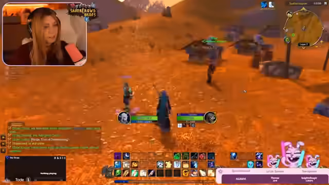 02:11:49Die Streamerin diskutiert die Bedingungen für den Beitritt zu einer neuen Gilde. Sie hat Bedenken, da eine Bürgschaft erforderlich ist und der Größenzuwachs für niedriglevelige Spieler schwierig werden könnte. Gleichzeitig wird die Gilde als exklusives Event für Streamer beworben, was für sie ein zwiespältiges Gefühl erzeugt. Die Gruppe befindet sich nun in einem PvP-Gebiet der Horde, wo sie vorsichtig sein müssen, um nicht von gegnerischen Spielern angegriffen zu werden. Ein Gruppemitglied wird abgelenkt und getötet.