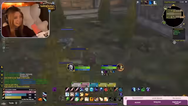 01:37:15Die Streamerin plant, mit der Gruppe einen Dungeon namens Friedhof zu machen, bevor sie nach Stormwind fliegen. Sie erwähnt, dass sie einen Flugpunkt in der Nähe hat, aber keinen Ruhestein. Während der Kommunikation treten technische Probleme auf, wie lautes Feedback und fehlende Funktion der Proximity Chat. Einige Gruppenteilnehmer sind noch nicht im Zielgebiet angekommen, was die Organisation verzögert. Der Streamer fragt den Chat nach Empfehlungen für alternative Spiele wie GTA-RP.