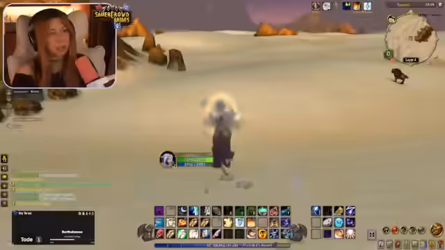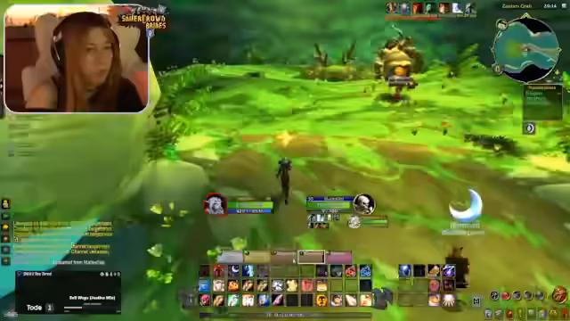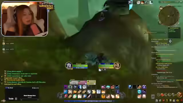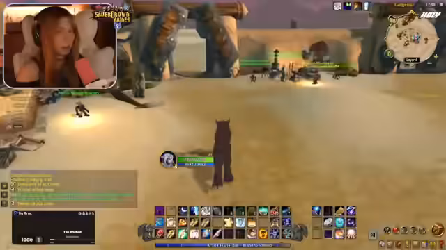 02:20:49Nach intensivem Grinding von Mobs und dem Abschließen von Quests erreicht die Streamerin mit ihrer Mitspielerin Level 50. Dies wird als großer Meilenstein im Spiel gefeiert. Anschließend werden weitere Streamer per Port in die Gruppe eingeladen, um gemeinsam in Booty Bay den Buff zu holen. Die Streamerin organisiert den Portprozess für ihre Zuschauer, die sie in den Spielernamen 'Hänky' und 'Jen' erkennt.
