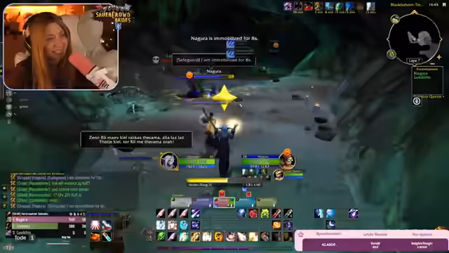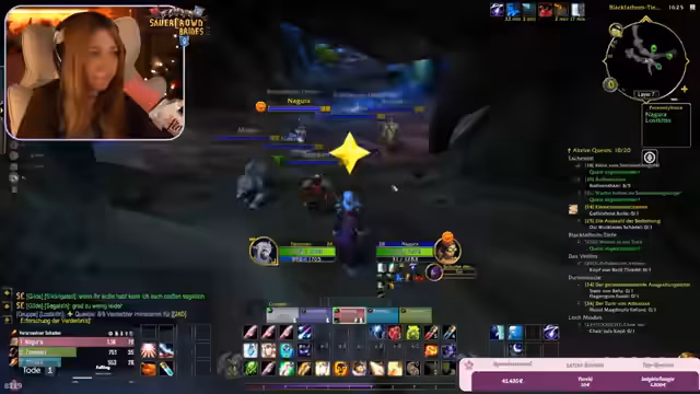 01:44:50Die Gruppe plant ihren nächsten Dungeon, die "Tiefschwarze Grotte". Die Streamerin überlegt, ob sie in Zukunft mehr heilen statt tanken möchte, da sie den Tank-Parler als "risky" empfindet. Sie diskutiert die Rollen im Team und ihre möglichen Spezialisierungen als Shadow Priest oder Retri Paladin. Anschließend werden die Pläne für den nächsten Dungeon besprochen, wobei man ein Schiff zur Anfahrt nutzt und ein Buff für die Unterwasserphase erhält. Die Gruppe achtet darauf, sich nicht zu verlaufen und den Kampf sicher anzugehen.