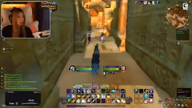 01:32:16Der Streamer kehrt zum Gameplay zurück und muss seine klemmende Tastatur reinigen, woraufhin er einen Sauger holt. Er trifft in der Spielwelt auf Mitspieler und fragt, ob sie gemeinsam einen Dungeon besuchen, woraufhin sie dies planen. Er spricht über seine Levels, seine Klasse als Priester und seine_specs. Es gibt Abstimmungen über den zu besuchenden Dungeon, Bankgeschäfte und das Borgen von Gold für einen neuen Skill.