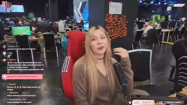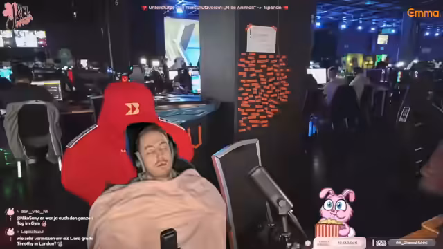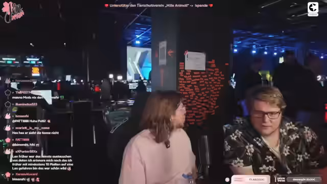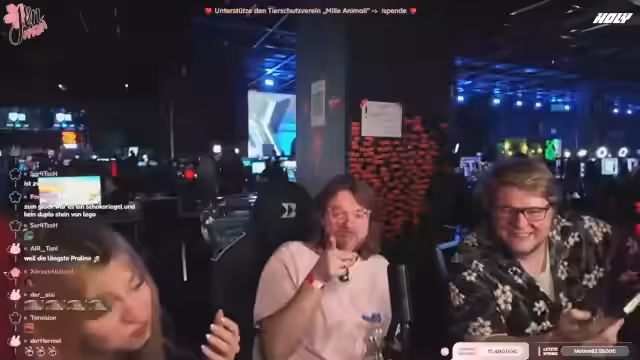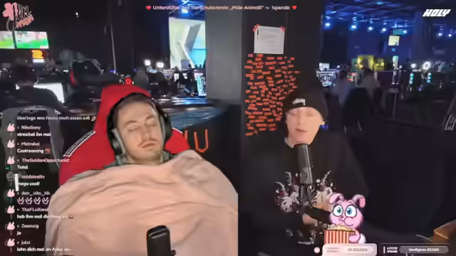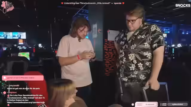 08:09:02Da der eigentliche Streamer Jen müde ist und schläft, übernimmt der aktuelle Streamer die Moderation. Er interagiert mit dem Chat und fragt nach, ob Zuschauer eher Jen beim Schlafen oder ein Gespräch bevorzugen. Später wird eine spontane Spendenaktion für ein Tierheim ins Leben gerufen. Mit einem sichtbaren QR-Code werden die Zuschauer aufgerufen, zu spenden, was zu einem regen Spendenaufkommen führt. Die Namen der Spender werden schrittweise auf eine Wand projiziert.