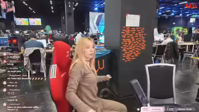 01:09:28Nachdem die grundlegende Technik-Notwendigkeit gesichert scheint, geht die Streamerin auf Erkundungstour durch die Halle. Sie beschreibt die Situation als noch sehr ruhig und wenig frequentiert. Viele Teams stehen noch in den Anfangsstadien des Aufbaus. Bei dieser Gelegenheit werden auch erste interessante Stände wie Rocket Beans und Trillux entdeckt, die selbst Turniere veranstalten wollen. Der Spaziergang ist eine Gelegenheit, die Dimension und die generelle Stimmung der Veranstaltung einzuschätzen.