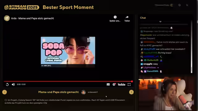 07:52:08Bei der Wahl des 'Clip des Jahres' hat die Streamerin eine Auswahl zwischen verschiedenen Kandidaten. Dazu gehören humoristische Missgeschicke wie 'Kochen fetzt', eine 'Datenschutzpapier'-Auseinandersetzung, ein 'Character Break'-Moment und emotionale wie 'Mama und Papa stolz gemacht'. Sie äußert ihre enorme Entscheidungsschwierigkeit und bittet den Chat um Rat.