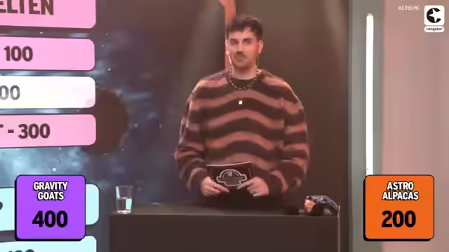 00:20:17Nach einer kurzen Pause werden die Teams im Studio vorgestellt: Team Astro-Alpakas (Baso und Jenyan) und Team Gravity Goals (Leon und Kaddi). Es handelt sich um eine Quizshow, bei der die Teams gegeneinander antreten. Streamer erwähnt, dass bereits eine Probe stattgefunden hat, bei der verschiedene Fragen aus den Bereichen Allgemeinwissen und Gaming getestet wurden. Die Gewinner erhalten am Ende Belohnungen, und es gibt auch Giveaways für die Community.