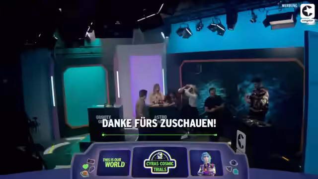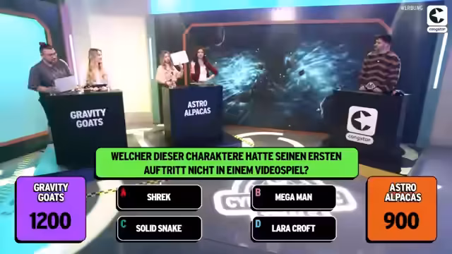 01:15:55Im Verlauf des Galaxy-Glide-Spiels werden verschiedene Fragen gestellt, darunter nach dem Erscheinungsjahr der ersten Minecraft-Version (2009) und nach dem Namen der außerirdischen Bedrohung in der Mars-Effekts-Reihe. Die Teams antworten gleichzeitig, während der Chat abstimmt. Punkte werden vergeben, wenn die Teams oder der Chat richtig liegen. Es zeigt sich, dass einige Fragen für die Teams schwierig sind, während die Community manchmal schneller die richtige Antwort findet.