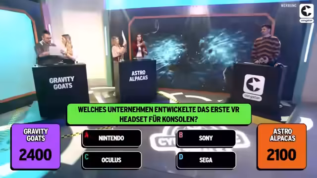 01:39:46Die Teilnehmer identifizieren, welche Filme keine Videospiel-Adaptionen haben, wobei 'Inception' korrekt ist. Die letzte Quizfrage nach dem ersten VR-Headset für Konsolen wird mit 'Nintendo' beantwortet, das mit dem 'Virtual Boy' aus dem Jahr 1995 antwortet. Die Teams und die Community haben hier teilweise falsche Annahmen.