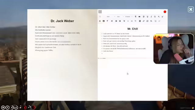 01:31:57Ein intensives Gespräch mit Dr. Weber wird verdaut, da er der Streamerin seine Liebe gestanden hat. Die Streamerin und Harmony diskutieren über ihre Gefühle für Dr. Weber und die Intensität ihrer zwischenmenschlichen Verbindung. Kitty Rose wird als 'kleine Bitch' bezeichnet. Dr. Weber wird für seine Arbeit als Richter gelobt, und die Diskussion über eine Lopinienblume auf seinem Schreibtisch führt zu einer humorvollen Drohung der Streamerin, die Verursacherin zu finden und zu bestrafen. Die Streamerin betont, dass sie nicht über Dr. Weber sprechen möchte, um seine Zickereien zu vermeiden. Es kommt zu einer Auseinandersetzung über Vertrauen und die Weitergabe von Informationen, wobei die Streamerin der anderen Person droht, obdachlos zu werden, sollte sie weiterhin Gerüchte verbreiten oder ihren Ruf schädigen. Die Streamerin fühlt sich eingeengt und kritisiert, dass andere Leute über ihre Beziehungen sprechen. Sie äußert ihre Frustration über die Situation und betont, dass sie sich nicht weiter verbiegen wird. Dr. Weber wird als jemand beschrieben, der wechselhafte Launen hat, nicht konsequent sein kann, gerne droht und prahlt, materialistisch ist und teure Geschenke macht. Er ist Mitglied des Gentleman's Club und endlos in die Streamerin verliebt.